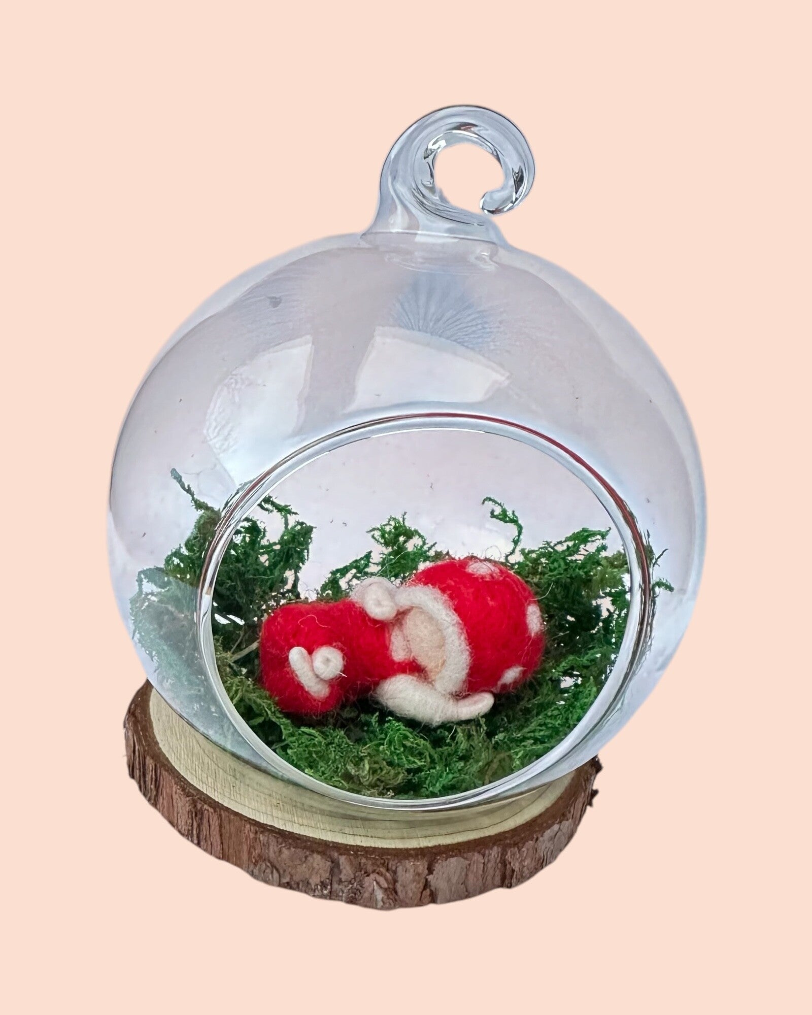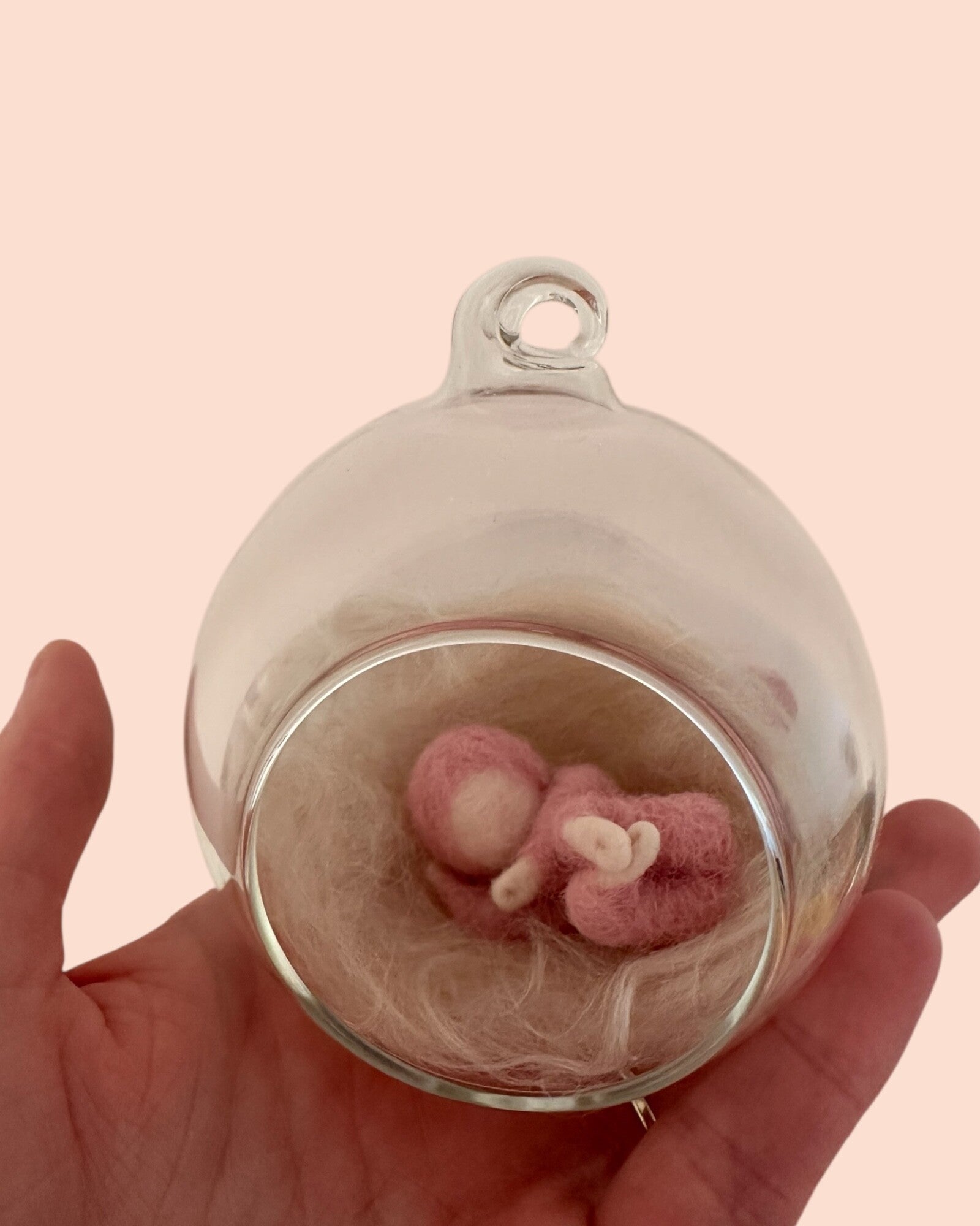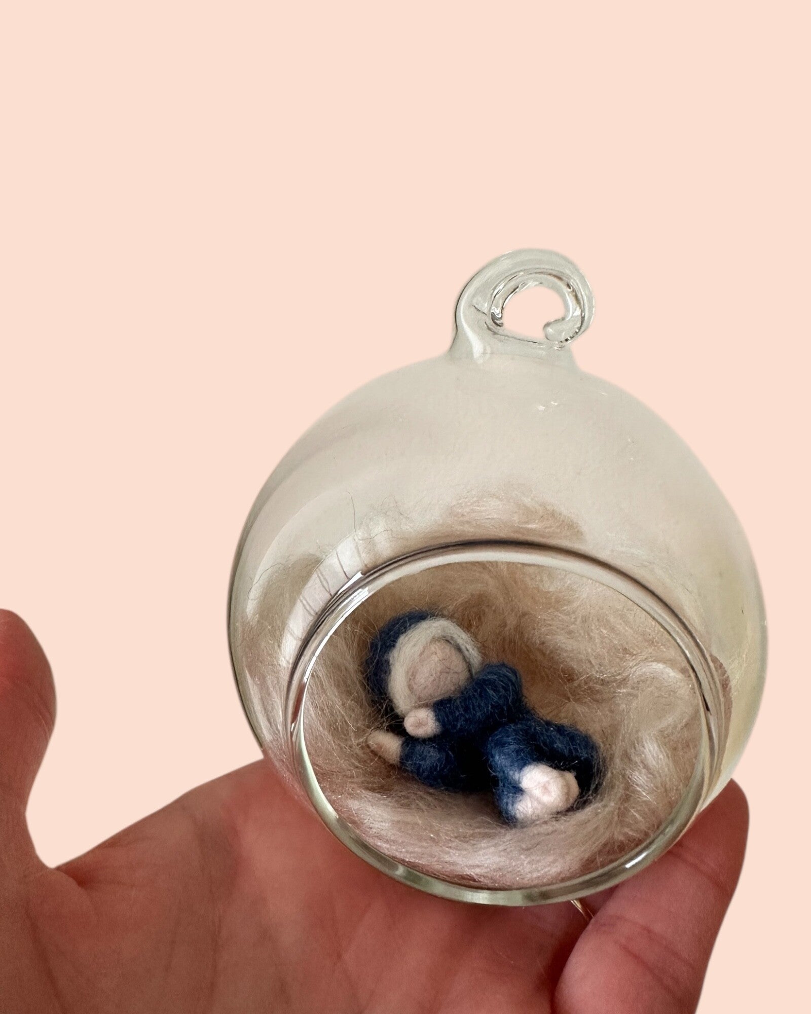 De kindjes in glazen bol zijn gemaakt van zachte schapenwol, rond een frame van ijzerdraad. Er is gebruik gemaakt van Bhedawol uit Nieuw-Zeeland. De glazen bol heeft een afmeting van .. cm bij .. cm. Hier boven ziet u welke kleuren kindjes er beschikbaar zijn.